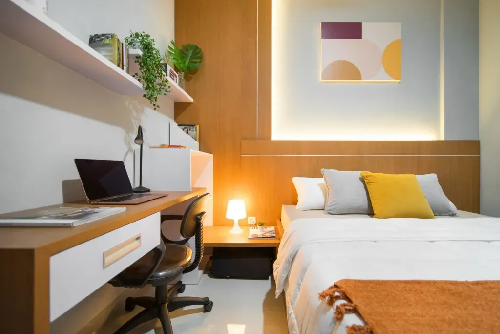 Kamu juga akan mendapatkan furnitur seperti meja kerja sendiri, nakas, lemari pakaian dan tempat penyimpanan, serta kamar mandi dalam. Karena ukuran kamarnya yang luas, kamu juga bisa menyewa kamar ini bersama teman atau pasangan kamu, lho.