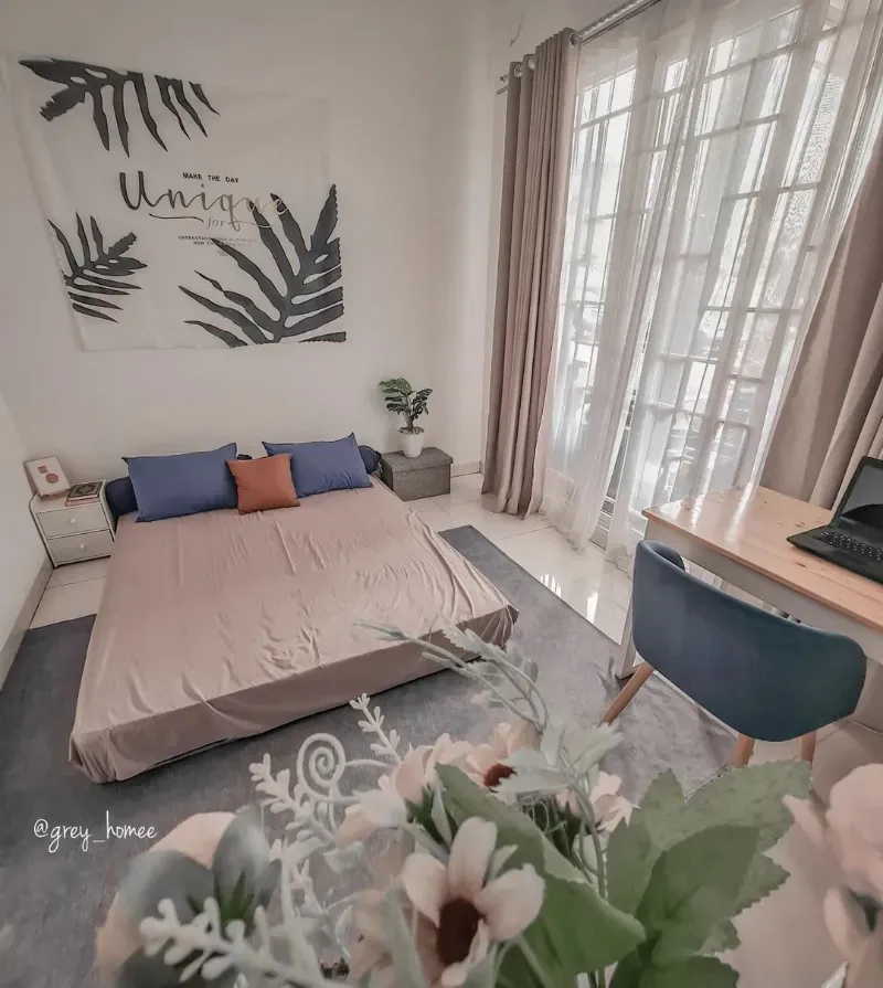 Palet netral dengan sentuhan cool-tone seperti inspirasi berikut ini dapat kamu terapkan sebagai desain kamar kost lesehan impian. Meski memiliki luas kamar yang tidak terlalu besar, namun kehadiran kasur lantai mampu membuat keseluruhan kamar menjadi lebih lapang, terutama bila meja kerjamu memang membutuhkan lebih banyak ruang di dalam kamar.